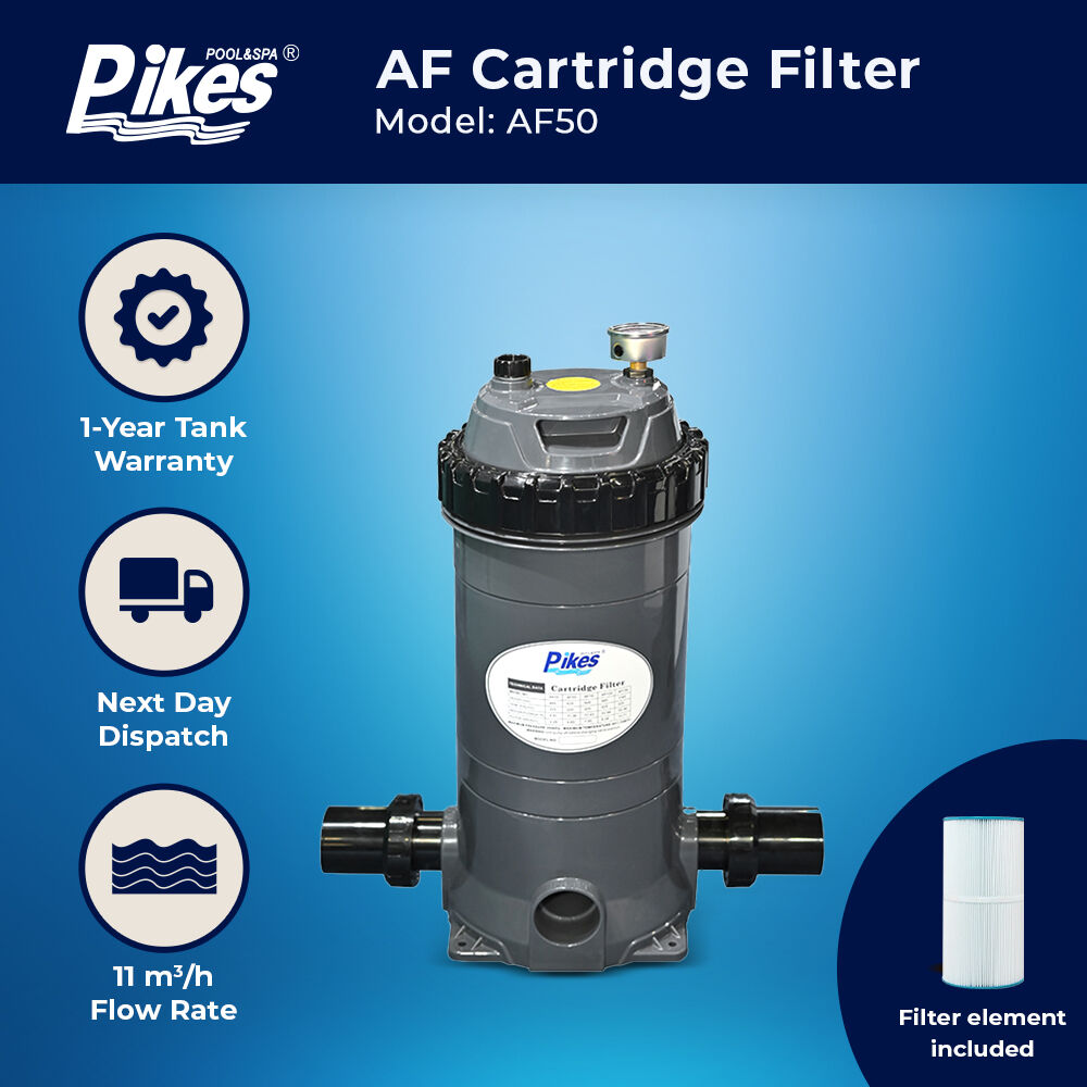 Cartridge filtration is an effective trouble-free proven method of filtration. Pool water enters the filter and passes through a polyester single element cartridge. Suspended particles are trapped and the water is returned to the pool. As the build-up of dirt in the element increases, so the water pressure rises and the flow decreases. When the pressure reaches an unacceptable level, the element must be removed and cleaned.