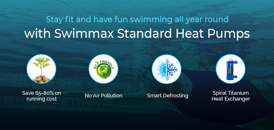 Heat pumps are also considerably cheaper to run than electric or gas heating saving you up to 75%, Solar heating tubes on your roof require a lot of plumbing to install, need a pump to run, can be unsightly and NEED THE SUN! You can run your Swimmax Pool Heat Pump 24/7 quietly and economically in the cold and without the sun! They will work in temperatures from -15 degrees c to + 43 degrees c.This Swimmax Pool Heat Pump is also quiet at 50 DB(a)