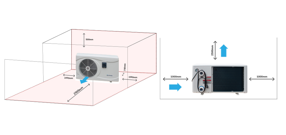 The unit may be installed in virtually any outdoor location as long as the specified minimum distances to other objects are maintained (see drawing below). Please consult your installer for installation with an indoor pool. Installation in a windy location does not present any problem at all.